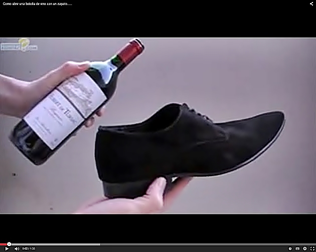 Cuando creemos haber visto todo en You Tube, aparece un francés que armado de un zapato da pautas para sacarle el bendito corcho a una botella de vino. Vea la imagen y aplique los pasos enseñados de forma escrupulosa.