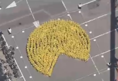 351 personas vestidas con impermeables amarillos establecieron en Tokio un récord mundial al formar la mayor imagen humana de PAC-MAN, en homenaje al videojuego creado por Toru Iwatani hace 35 años.