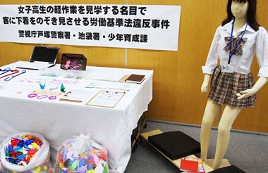 Tras un paciente seguimiento, agentes de Departamento de la Policía Metropolitana intervino un departamento en el distrito de Ikebukuro, Tokio, donde escolares menores de 18 años de edad confeccionaban grullas de origami que ponían bajo su falda para abrir las piernas a pedido de clientes varones que pagaban por ello.