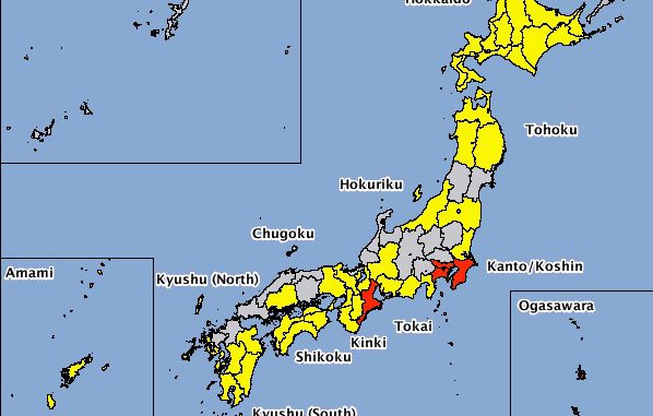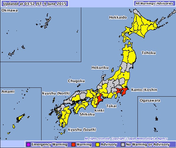 Fuertes lluvias que se desataron al promediar la medianoche, obligaron a la Agencia Meteorológica de Japón a emitir a las 03.52 horas de esta madrugada una advertencia de inundaciones en varias zonas de las provincias de Tokio, Kanagawa y Chiba.
