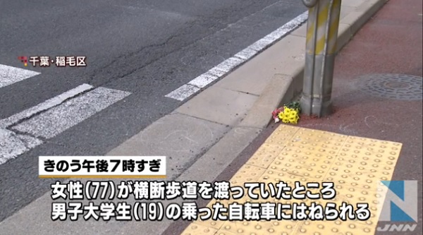 1- Un muchacho que manejaba con los auriculares puestos se pasa la luz roja y atropella de muerte a una mujer de 77 años en Inage, Chiba. TBS (JNN) (foto)