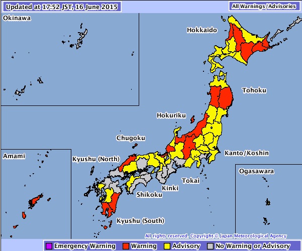 La Agencia Meteorológica de Japón emitió una advertencia de inundaciones y deslizamientos de piedra y lodo provocadas por fuertes lluvias en diez provincias repartidas por todo el país.