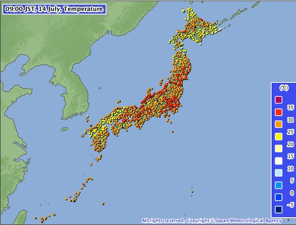Hoy será otro día de calor. A las 9 de la mañana los termómetros llegaron a 33,5 grados en Kamisatomi, provincia de Gunma, y a 34,4 grados en Fukishi en Toyama, frente al Mar de Japón.