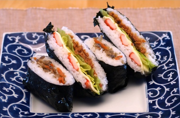 ¿Cómo se prepara? En primer lugar, extienda el nori en un envoltorio de plástico, coloque arroz cocido encima, en la parte central, y a continuación agregue los rellenos. Luego, doble las cuatro esquinas del nori hacia el centro y presione hacia abajo hasta que adquiera una forma uniforme. Envuélvalo con el plástico, corte por la mitad y listo.