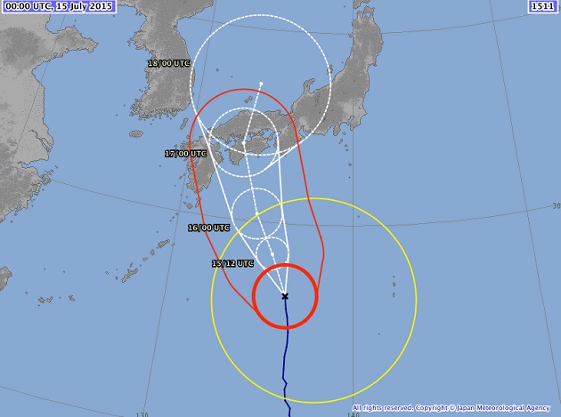 El tifón Nº11 o Nangka se acercará a la región de Kyushu mañana jueves y el viernes 17 de julio cruzará el archipiélago desde las 9.00 horas por la provincia de Kochi en dirección hacia el Mar de Japón, dijo un reporte de la Agencia Meteorológica.