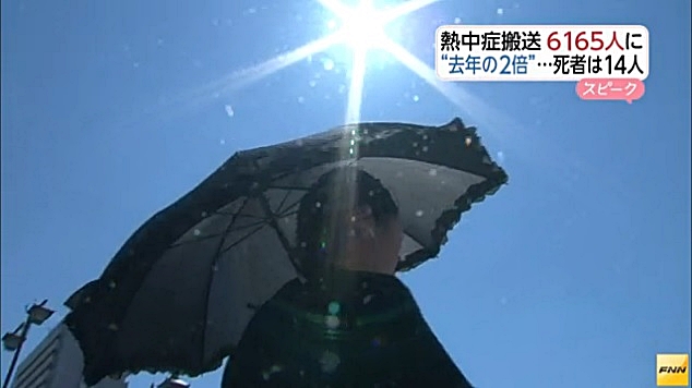 La semana pasada 6.165 personas fueron trasladadas de emergencia al hospital con síntomas de hipertermia (necchusho en japonés) por las altas temperaturas que golpean todo Japón. Es el doble de casos que la semana anterior de las cuales 3.322 personas son de la tercera edad. De éstas 14 fallecieron.