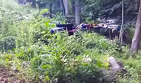 La grabación fue hecha en una zona boscosa y muestra al avión no tripulado elevándose a casi un metro del suelo impulsado por cuatro hélices.