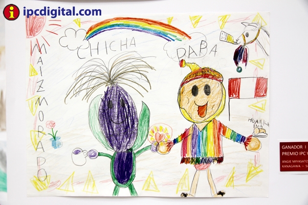 La pequeña creó así sus personajes. Le puso ojos, boca y piernas a una mazorca de maíz morado e inventó un hombrecillo con cabeza de papa y vestido con poncho del ekeko que sostiene un plato de papa a la huancaína. Su llama aparece tomando una botella de Inca Kola, la gaseosa peruana, y el cielo está adornado por un arco iris e iluminado con un sol rojo que parece el hinomaru japonés.