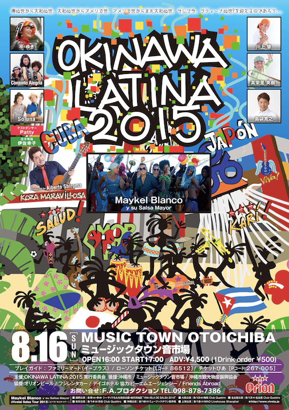Todo listo para el súper evento musical Okinawa Latina 2015 que se realizará este domingo 16 de agosto en Music Town Otoichiba en koza a partir de las 5 de la tarde y que para esta primera edición tiene como invitado especial a la agrupación cubana de Maykel Blanco y su Salsa Mayor que cierra así su gira por Japón.