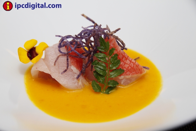El chef Dionicio se llevó los aplausos al llevarnos de lo japonés a lo nikkei en un solo suspiro. Preparó un sashimi de shima aji (jurel) con uni en una finísima vinagreta de ají amarillo y un tiradito, uno de los platos de pescado con más influencia japonesa de la cocina peruana, con kinmedai (besugo) bañado en una alucinante crema de ají amarillo y papa morada rayada.
