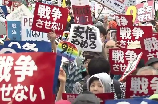Los asistentes, escoltados por una fuerte presencia policial, lanzaron gritos contra la que calificaron como «ley bélica» y acusaron al primer ministro de «destruir la democracia de Japón».