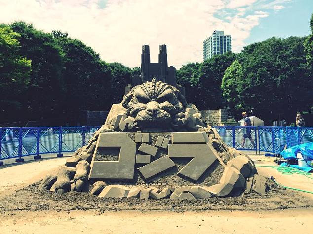 La figura representa la cabeza del monstruo radiactivo hasta la mandíbula superior con todo lujo de detalles, incluidos unos dientes fieros, el efecto duro y rugoso de la piel y los ojos penetrantes, un detallismo que Hosaka logró tallando la arena con cucharas y cepillos, reveló al diario Asahi.
