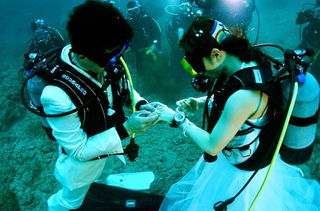 “Cuán profundo es tu amor”, cantaban los Bee Gees en la década de 1970. “Lo suficiente como para casarnos al fondo del mar”, podrían decir los esposos Yusuke (31) y Emi Asada (32).