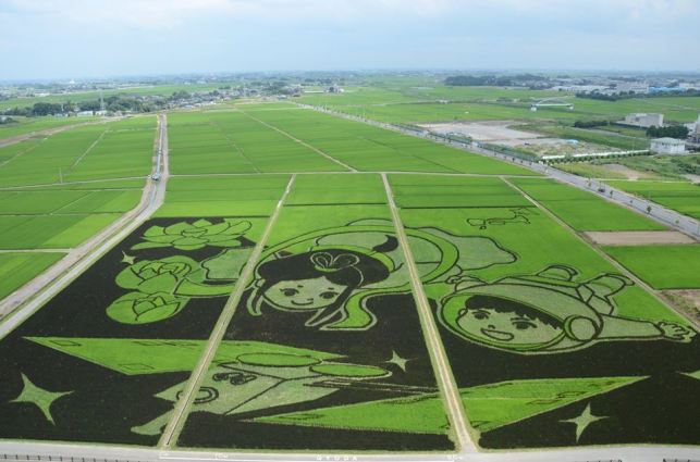 Una obra artística de grandes dimensiones en un campo de arroz en la localidad de Gyoda, Saitama, para cuya creación se utilizaron siete tipos de plantas de arroz de diferentes colores, ha sido reconocida por Guinness World Records como el mayor mosaico de campos de arroz del mundo.