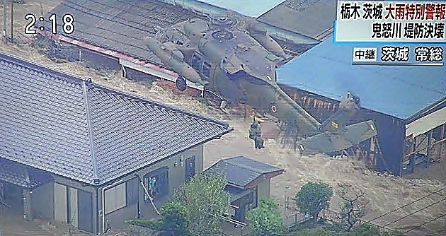 Intenso trabajo de los helicópteros de las Fuerzas de Autodefensa que hasta el momento han rescatado a una veintena de personas atrapadas por el feroz desborde del río Kinugawa en la provincia de Ibaraki.