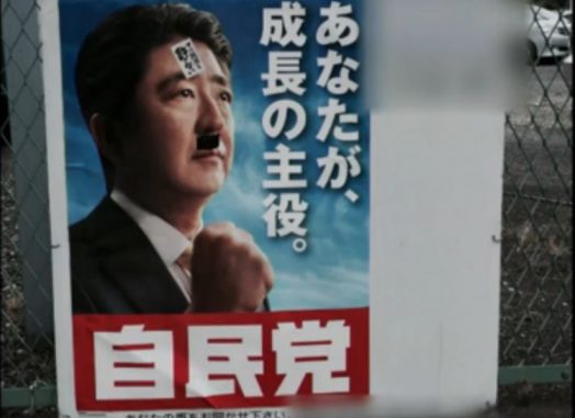 Takeshi Muto dibujó un bigote muy parecido al que tenía Adolfo Hitler en el rostro de Abe en un póster colgado en una valla situada dentro de un estacionamiento en la ciudad de Machida, informó Tokyo Reporter.