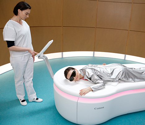 En el terreno de la salud, Canon enseñó una máquina para realizar mamografías fotoacústicas, un mecanismo que combina luz láser y ondas ultrasónicas para tomar imágenes tridimensionales de alta resolución de las mamas y que no requiere que se presione el pecho del paciente para la realización de la prueba médica.
