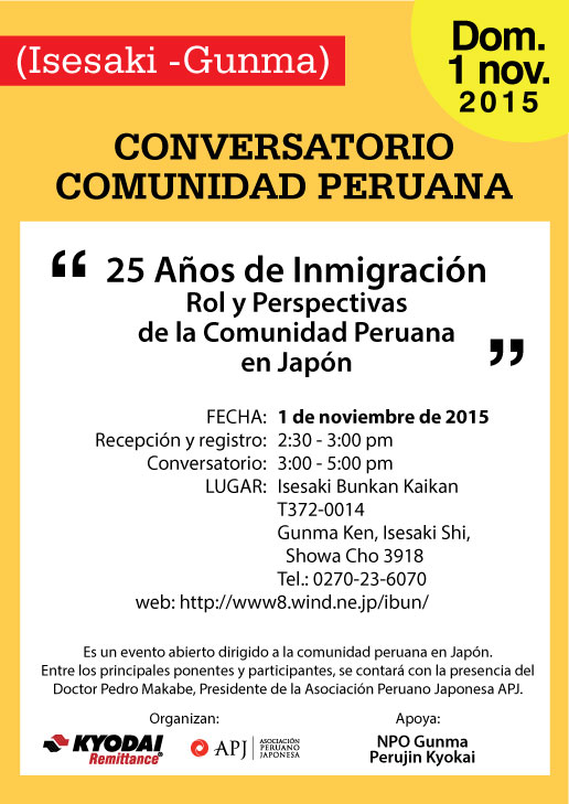El evento es organizado por Kyodai Remittance y la APJ con el apoyo de la NPO Gunma Perujin Kyokai y tendrá lugar en el Isesaki Bunka Kaikan desde las 15.00 hrs.