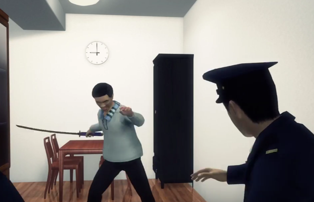 La policía, alertada por la amiga de la anciana, llegó a la casa de esta, donde el hijo atacó a dos agentes con una katana haciéndoles corte en la frente y el hombro.