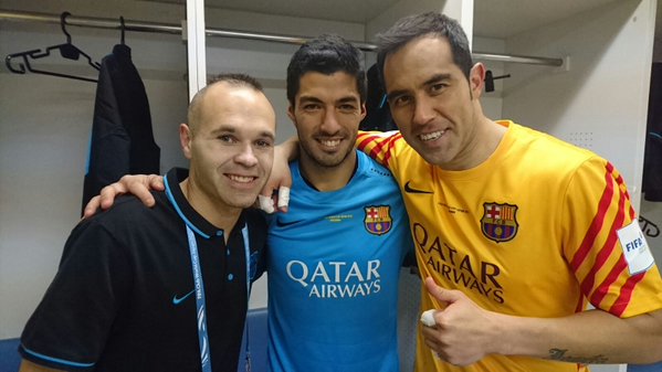 “Grande equipo!!! Ya estamos en la final”, escribió Andrés Iniesta en su cuenta de twitter para celebrar el triunfo sobre el Guangzhou chino por 3 a 0 por el mundialito de clubes FIFA en Yokohama. El mensaje iba junto a una foto junto al arquero Bravo y a Luis Suárez.