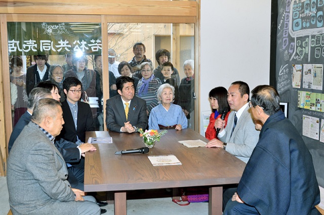 En abril, Abe visitó una comunidad para residentes de edad avanzada en el oeste de Japón que puede servir de modelo. El proyecto Share Kanazawa se levanta sobre un gran terreno con 32 casas para ancianos, junto con viviendas para estudiantes universitarios y niños con problemas mentales. Abe expresó su deseo de que el ejemplo de esta comunidad se replicara en el resto del país.