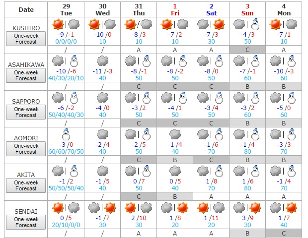 Clima en Japón del 29 de diciembre al 4 de enero del 2016