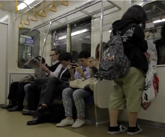 La autora del artículo relata que en un tren en Londres vio a una chica ponerse de pie y sentarse en el regazo de su novio para que una anciana pudiera sentarse. Algo que casi nunca ocurre en los trenes en Tokio, dice, pero que no estaría mal imitar.