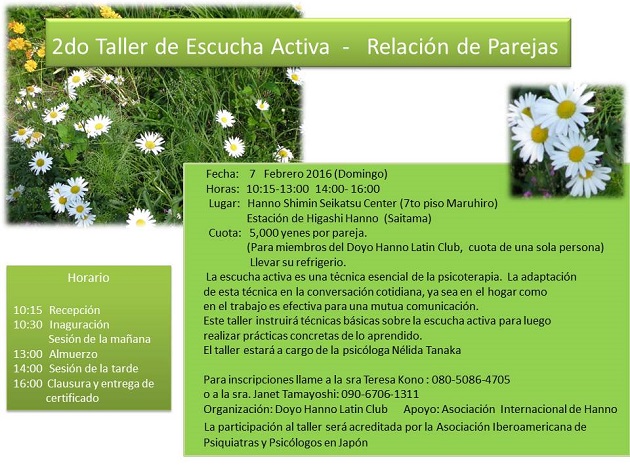 La reconocida psicóloga Nélida Tanaka será la encargada de dictar el II taller de Escucha Activa en la Relación de Pareja a realizarse el próximo 7 de febrero en el Hanno Shimin Seikatsu Center, cerca a la estación de tren Higashi Hanno en Saitama.