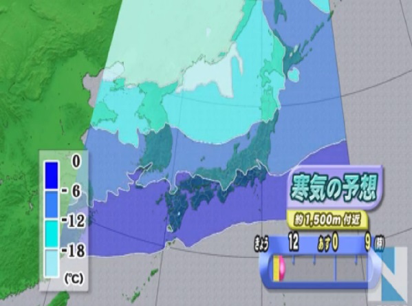 El pico del frío y una tormenta de nieve será el domingo 24 y lunes 25 con mayor peligro en las provincias del litoral del Mar de Japón. La televisión japonesa ha alertado a la población ante prolongados cortes de luz e interrupción total del transporte y ha pedido juntar kerosene, comida, linternas, pilas y no conducir carro sin que las llantas tengas sus cadenas de tracción.
