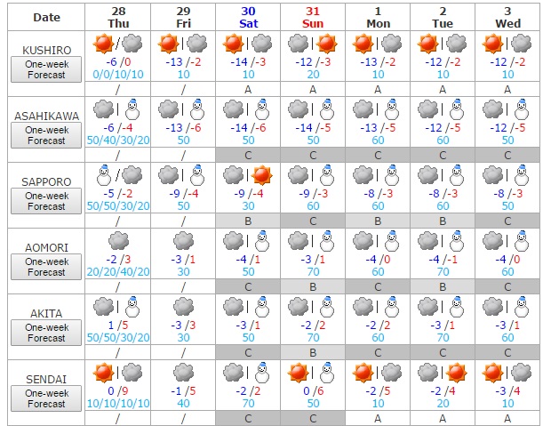 Previsión del tiempo para la semana del 28 de enero al 3 de febrero, según la Agencia Meteorológica de Japón.