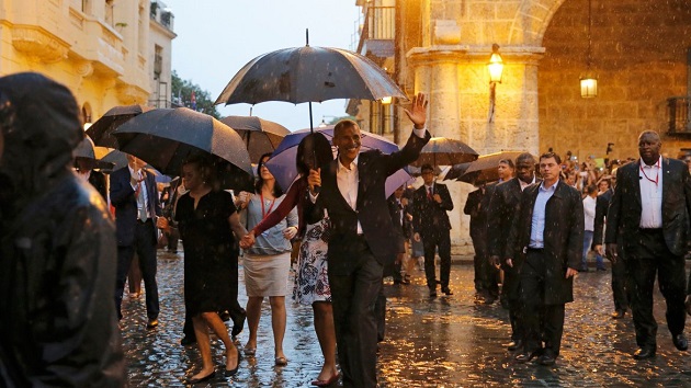 El presidente de Estados Unidos, Barack Obama, junto a su esposa Michelle y sus hijas Sasha y Malia, visitaron hoy La Habana Vieja, el centro histórico de la capital de Cuba, un paseo que tuvieron que realizar protegidos por paraguas debido a la lluvia que les ha recibido en la ciudad.
