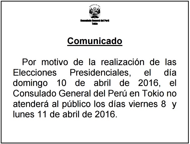 El Consulado General del Perú en Tokio anunció hoy que debido a las Elecciones General peruanas, a realizarse el domingo 10 de abril, no habrá atención al público este viernes 8 y el próximo lunes 11.