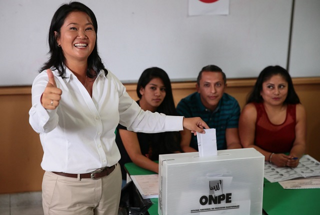 Según la empresa Ipsos, Fujimori recibió 37,8 % de los votos, Kuczynski, del derechista Peruanos Por el Kambio, 20,9 % y Mendoza 20,3 %, del izquierdista Frente Amplio.