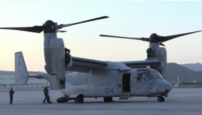 Los dos Ospreys partieron de la base de Iwakuni, ubicado en la prefectura de Yamaguchi. Tras aprovisionarse de agua, mantas, baños portátiles y otros artículos en el Aeropuerto de Kumamoto, llegaron a un parque en el pueblo de Minamiaso, una de las zonas más afectadas por los desastres.