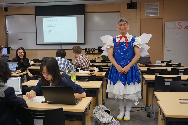 Sugiura revela que algunos de sus disfraces son hechos por él mismo y que no suele usar pelucas durante sus clases.