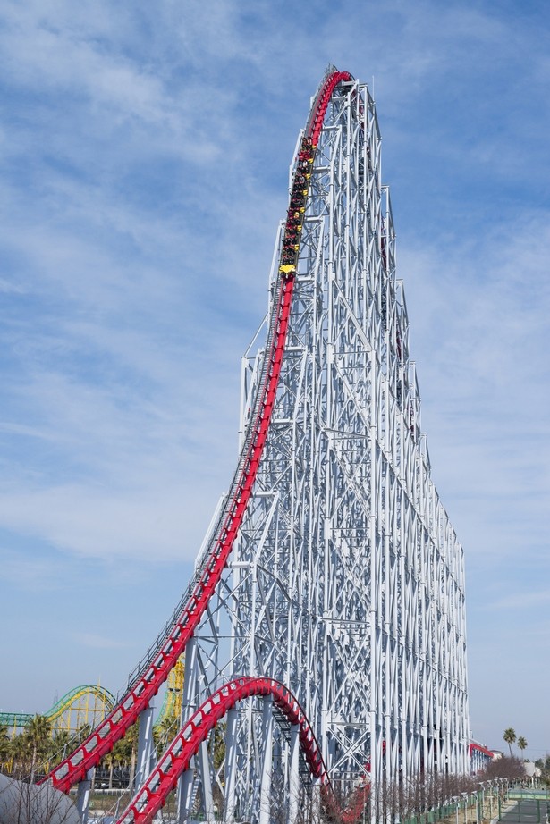 Steel Dragon 2000 en Nagashima Spa Land de Mie スチールドラゴン2000, ナガシマスパーランド, 三重県. Es la montaña rusa más larga del mundo con 2.479 metros. Su nombre se debe a que fue inaugurada en el Año del Dragón y ha sido renovada en el 2013 con nuevas butacas en donde la barra de seguridad baja al límite para una sensación terrorífica de más amplitud en pleno cielo.