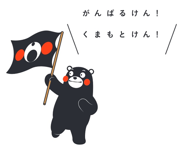 El emblema muestra a Kumamon, la mascota de la prefectura, un amigable oso de mejillas rojas, sosteniendo una bandera, con un mensaje de aliento que dice «Ganbaru-ken! Kumamoto-ken!».