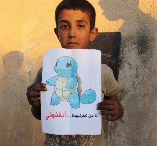 Esta organización opositora ha difundido fotografías de menores sirios con carteles en los que se ven personajes de Pokémon y mensajes como «Estoy en Kafranbel, en Idleb, venid a salvarme» o «Soy de Kafr Nabuda, salvadme».