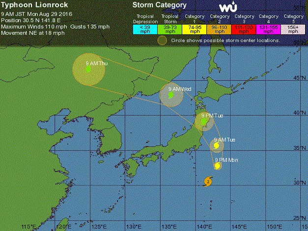 Si mantiene su rumbo, el tifón Lionrock podría ocasionar lluvias en Tohoku de 200mm con truenos y tornados. Kanto también será afectada. ANA y JAL suspenden vuelos