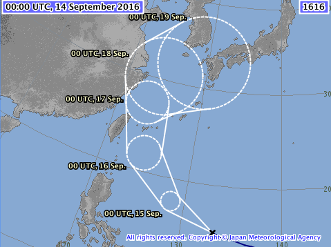 A esta hora, el tifón 16 se mueve con fuerza sobre el mar de Filipinas y se prevé que se hará más poderoso con vientos máximos superiores a los 200km/h, equivalentes a un huracán de categoría 3 o 4 este jueves 15 de septiembre por la noche o la madrugada del viernes 16.