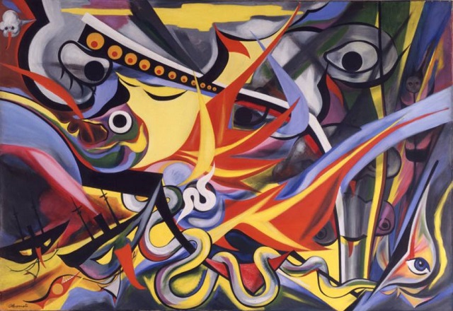El artista Taro Okamoto, amigo del surrealista Andre Betón, recurre a los contrastes de colores elementales y las formas sinuosas para crear también corrientes de movimiento, chasquidos pictóricos, en su obra «Hombres en llamas», una de las primeras denuncias contra la catástrofe nuclear.