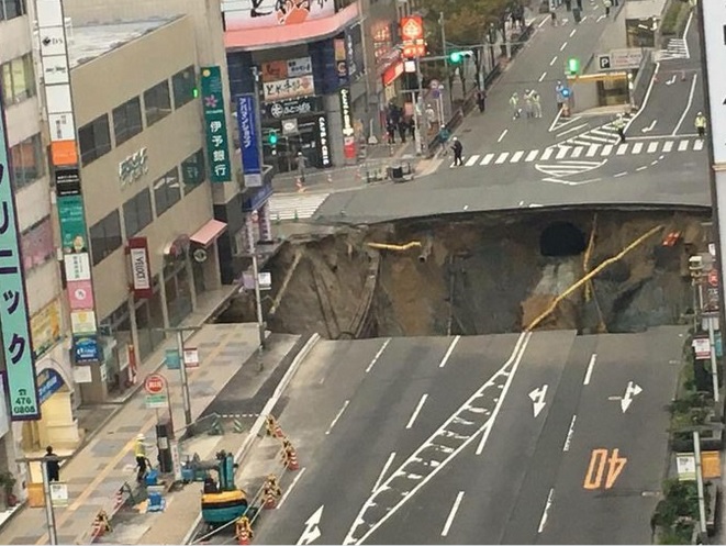 El pavimento comenzó a hundirse en un cruce entre dos importantes avenidas frente a la estación ferroviaria de Hakata, la mayor de la ciudad, en torno a las 5.15 hora local (20.15 GMT del lunes).