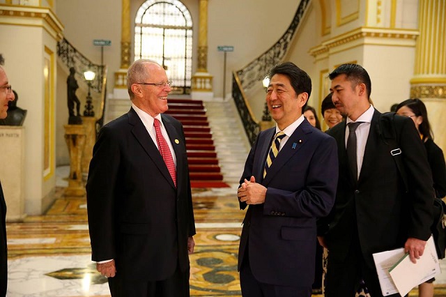 Abe se trasladó al Palacio de Gobierno en el centro de Lima, minutos después de arribar a Perú, para reunirse con Kuczynski y revisar diversos temas de la agenda bilateral.