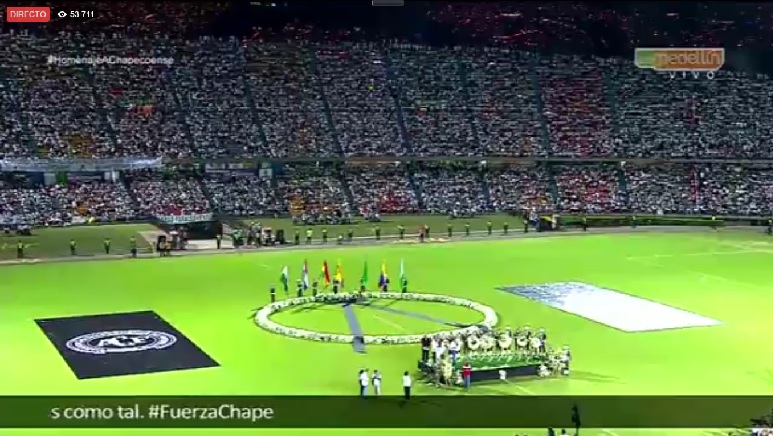 Miles de personas abarrotaron esta noche el estadio Atanasio Girardot de Medellín para rendir un homenaje póstumo al equipo de fútbol brasileño Chapecoense, la mayoría de cuya plantilla pereció en el accidente aéreo del pasado lunes cuando se dirigían a esta ciudad del noroeste de Colombia.