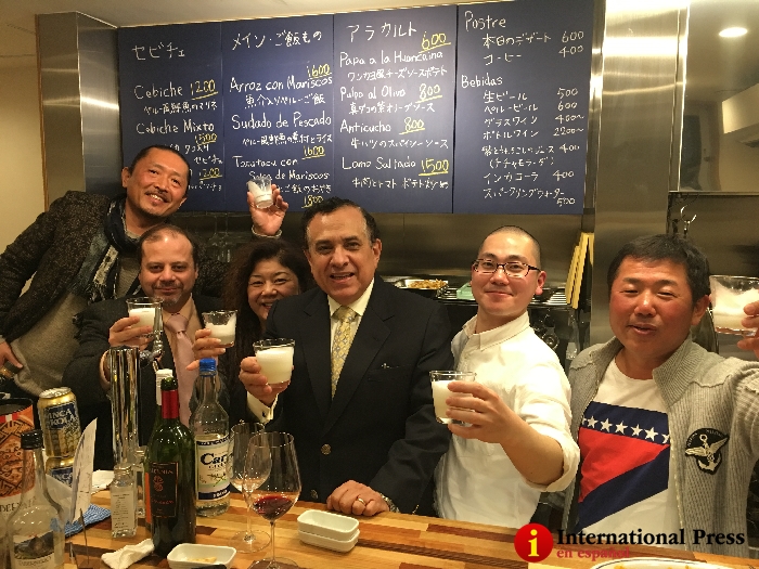 «Aspiro a tener una cebichería feliz», dijo Hiro a International Press mientras levantaba su vaso para brindar con el embajador Escala, el consejero de la embajada, Mario Bustamante, y sus clientes japoneses.