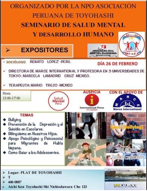 «Salud Mental y Desarrollo Humano», es el título del seminario organizado por la Asociación Peruana de Toyohashi para este domingo 26 de febrero con la participación del sociólogo Renato López, miembro del Centro Salud Mental Perú, la conocida Marcela Lamadrid, directora de Marce Internacional de Tokio y el terapeuta Mario Trejo.