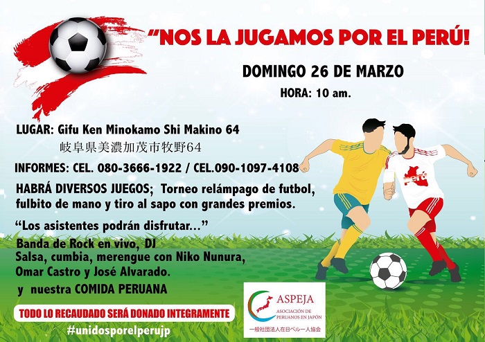 “Nos la jugamos por el Perú” es el nombre del evento organizado por ASPEJA, la Asociación de Peruanos en Japón que preside Carlos Galarzza, y que cuenta con el respaldo de voluntarios, comercios además de artistas que se darán cita en la conocida “Cancha del Bigote”, un conjunto de campos ubicados en Minokamo, Gifu, administrados por el brasileño Marcos Irala quien los ha cedido totalmente gratis.