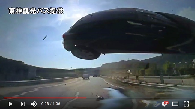 El sábado en la mañana, en una autopista en Japón, un coche voló literalmente y se estrelló contra el parabrisas de un autobús de turismo.