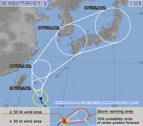 El tifón podría afectar algunas islas del extremo okinawense en la mañana de este lunes 3 de julio y el martes 4, poco después del mediodía, alcanzaría la región sureña de Kyushu y atravesaría Japón en la mañana del miércoles 5.