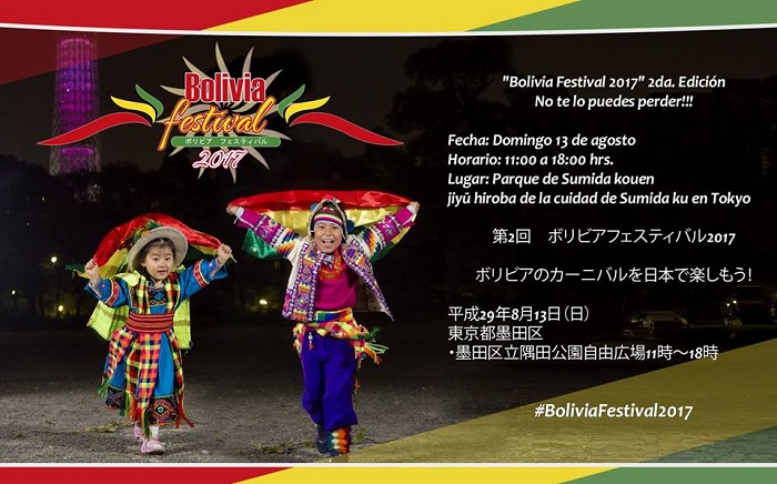 Se trata del Festival Bolivia 2017 que conmemora el 192 Aniversario de la Independencia boliviana cuya fecha central fue el 6 de agosto. El evento tendrá lugar este domingo 13 en el Parque de Sumida Kouen Jiyū Hiroba, ubicado al costado de río Sumida.
